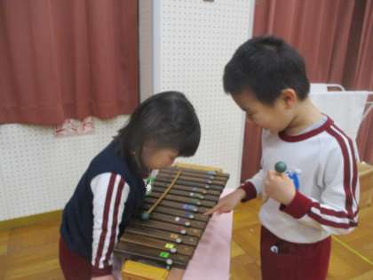 5歳児クラスの劇遊びや歌、合奏を見にいきました。大きな声でせりふを言ったり、堂々と体を動かして表現したり、友達と息を合わせたりする姿に魅了され、釘付けになって見ていました。合奏を見た後には、5歳児の友達とペアになり、いろいろな楽器に触れて遊びました。楽器の使い方を丁寧に教えてもらい、音を鳴らすことができ、大喜びでした!