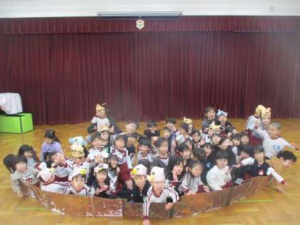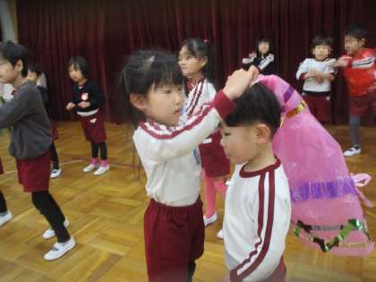 また別の日には、3クラスで劇遊びごっこをしました。自分たちの遊んだお話遊びを他クラスの子どもと一緒にできることが、嬉しそうでした。教えてもらうクラスの子ども達も、なりきって演じていて可愛らしかったです。