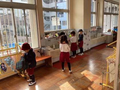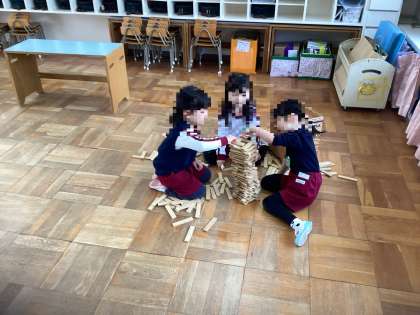 水曜日からお知らせしていたので、ワクワクしながら登園してきた子どもたち。つき組に来てからも、笑顔で挨拶をして、いつもよりも素早く用意を終わらせて、つき組のおもちゃを使って遊んでいました。