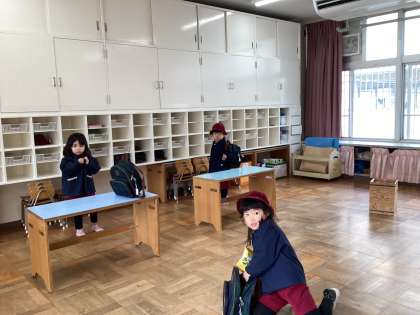登園後、進級する準備として、自分で階段を上ってつき組の部屋で朝の用意をしました。