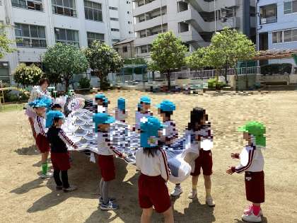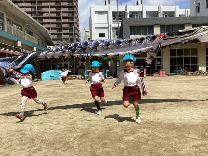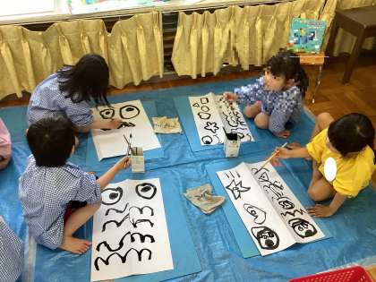 大きなこいのぼりを広げてみたり、こいのぼりの中を通ってみたり、こいのぼりに向かって走ったりと楽しんだ後に墨を使ってこいのぼりの顔や模様をかきました。それぞれイメージを膨らませてかくことを楽しんでいました。