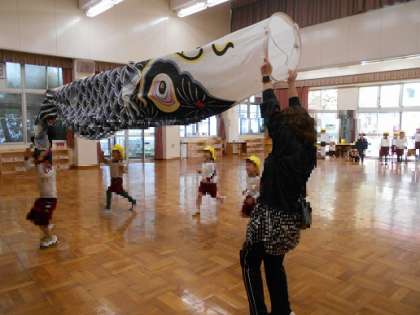 遊戯室でこいのぼりのお話をした後、みんなでこいのぼりになりきって空を泳いだり、先生こいのぼりと追いかけっこをしたり、こいのぼりにタッチゲームをしたりして、元気いっぱい遊びました。