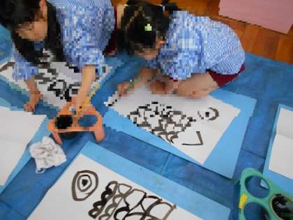 「元気いっぱい遊べるように、一人ひとりのこいのぼりをつくりたい!」という話になり、みんなでこいのぼりをつくることにしました。「こいのぼりのうろこはどんなうろこにしようかな?」「私はウィンクしている目にしよう」など、思い思いにイメージを広げながら墨で模様をかいていました。この後、こいのぼりに色をつけることを楽しみにしていたつき組の子どもたちです。