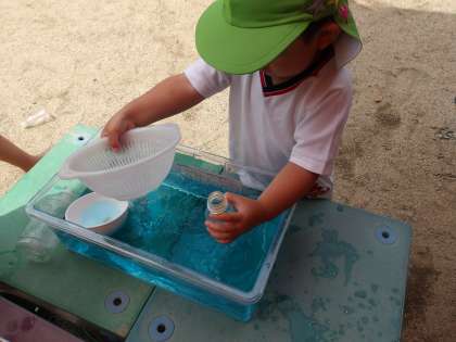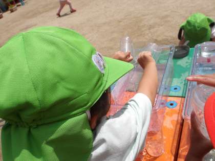 水槽に入った赤・青・黄の色水をカップですくったり、おたまですくって容器に入れたりして楽しんでいます。好きな色の色水をすくっては水槽に返し、またすくってを繰り返したり、ざるですくったらどうなるか試してみたりして、夢中になって遊んでいます。二色の色水を混ぜて遊ぶ姿も見られています!