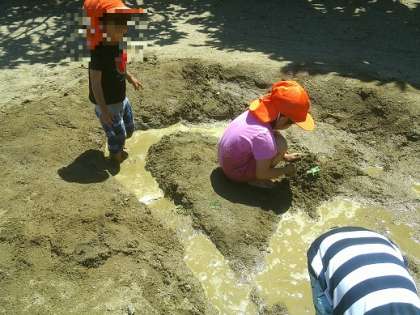 バケツで水をすくい、砂場に水を流すと、「泥んこになったよ!」とさらさらの砂が泥に変わっていく様子に驚く子どもたち。水たまりに足を入れてみると、「冷たいね」「ちゃぷちゃぷ気持ちいいね」と子どもたちは水の冷たさの感触を楽しんでいました。泥団子をつくったり、水や砂をといから流したりと思う存分体を動かして遊んでいます。