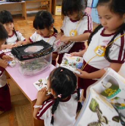 そしてついに!チョウになった時には「アゲハチョウと同じ模様だ!」「じゃー、アゲハチョウだね」と大喜びで、みんなで図鑑を広げていました。