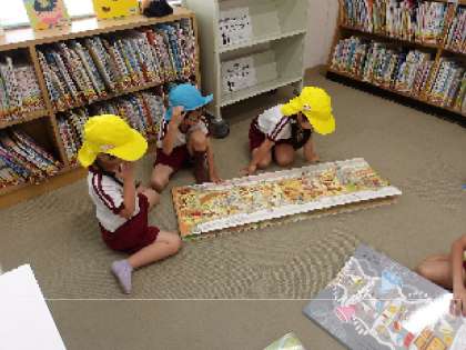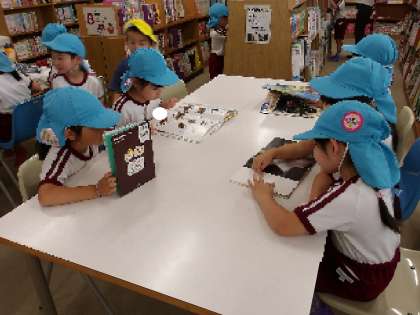 小学校の図書館に行き、いろいろな絵本を読むことを楽しみました。絵本や本がたくさんあり、「何を読もうかな?」とワクワクする様子や「幼稚園と同じ絵本があった!」と発見した喜びを感じる姿、見たことのない絵本も手に取り、「見て!面白そう」と友達や教師に知らせ姿も見られました。