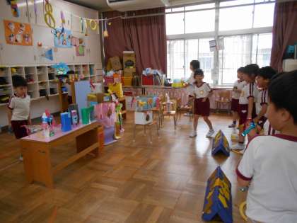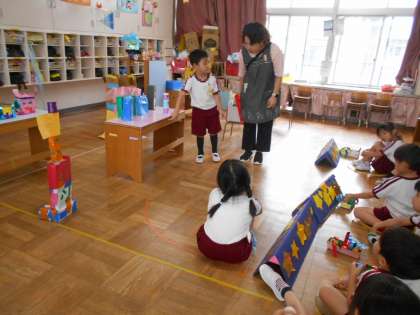 7月2日に、幼稚園で夏祭りをします。つき組では、普段から遊んでいる「かみひこうきとながれぼしぼーるのまとあてげーむ」のお店屋さんをします。どんな的をつくるのか、どこから投げてもらうのかを、みんなで話し合いながら少しずつお店屋さんができてきました。