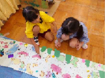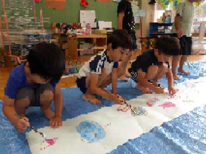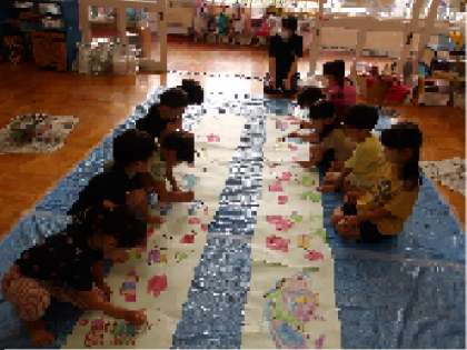 海のいきものをテーマに、長い紙にみんなで絵をかきました。絵の具やパス、ペンを使って海のいきものをかき、画用紙や折り紙で海藻や貝をつくって貼りました。「海にはどのようないきものがいるかな?」「魚以外にも何かあるかな?」とみんなで相談すると、たくさんのイメージが湧いて、「もう、かくところが無いよ!」と声が上がる程、紙いっぱいに伸び伸びと表現していた子どもたち。隣の友達に、「これは○○でね・・・」と、何をかいたのかお話ししている子どももいました。かいたりつくったりするのが大好きな、子どもたちの思いがたくさん溢れていました。