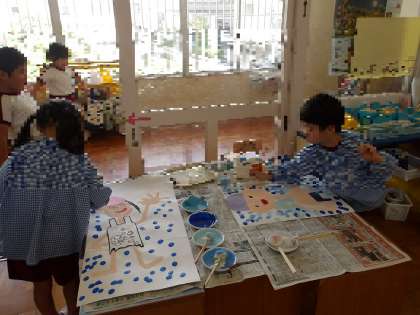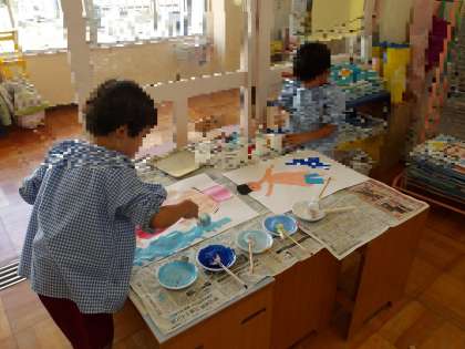絵の具で自分の顔や体をかき、画用紙でつくった水着を着せ、タンポで水を表現して「プール遊び」の絵をかきました。「水の中をもぐっているところ」「ビート板を使って泳いでいるところ」と友達と話をしながら、絵をかくことを楽しんでいました。
