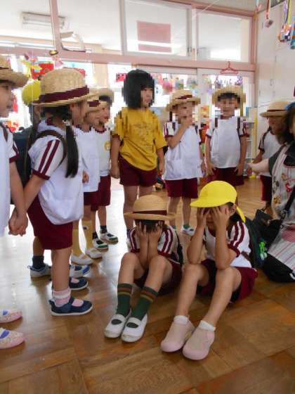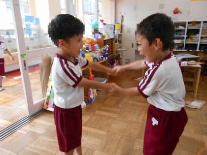 わらべうたの絵本をみんなで見てから、わらべうたを歌って遊びました。「かごめかごめ」では、手をつないで円になり、歌いながら回ることを楽しんだり、真ん中に人が入って目をつぶり、後ろの人を当てることを楽しんだりする姿が見られました。「なべなべ」では、歌に合わせて向かい合ったり、手をつないだまま背中合わせになったりすることを楽しみました。ほかにも「ちゃつぼ」や「うさぎとかめ」の歌で、指先や手の動きで遊びました。