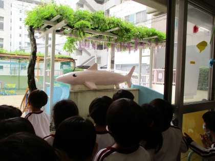 きれいに咲いた藤の花を見て、「いっぱい花ついてるなあ」「ハチさんも喜んでる」と興味津々の子どもたちです。