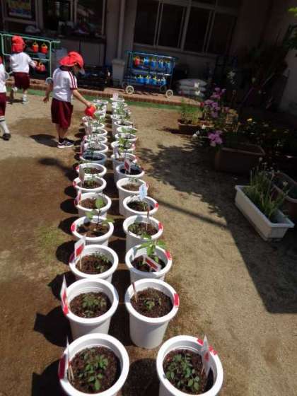 トマト・ナス・ピーマンの中から1つ選んで親子で植えました。