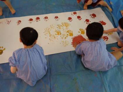 手に絵の具をつけて大きな紙にペタペタ楽しみました!