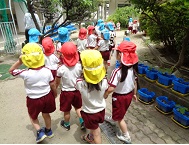 5歳児と4歳児で手をつなぎ、小学校のアジサイを見に行きました。