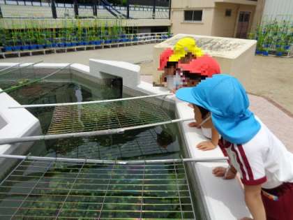 金魚やメダカもいて、興味津々の子どもたちでした。