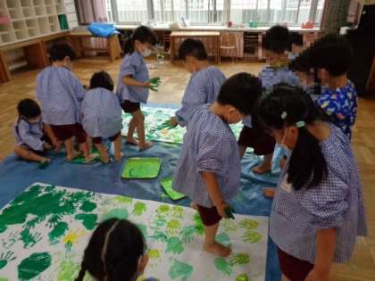 手や足に絵の具が付くことが気持ちよく「冷たい、気持ちいい!」の声が聞こえました。