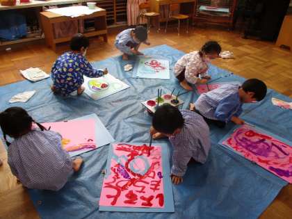 筆を使い書くことを楽しんだり、色を混ぜたり