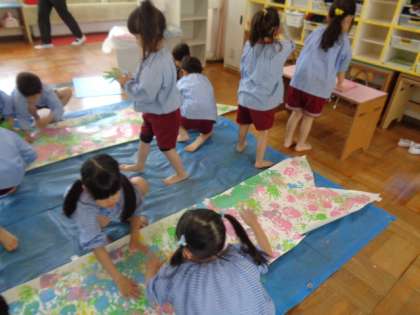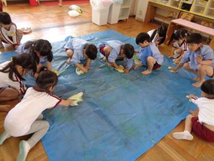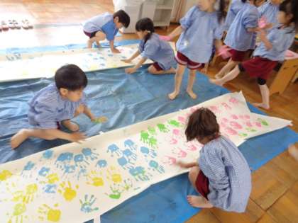 大きなこいのぼりに手型ぺたぺたしたよ! 公開日 2023/05/11 更新日 2023/05/11 5歳児 水の感触が気持ちよくなってきました。 大きなこいのぼりに、みんなで模様をつけよう!と絵の具を自分たちで用意しました。 両手に絵の具をつけて、思いきりぺたぺた!「色が混ざってきた!」「冷たくて気持ちいい〜!」と大喜び。何度も繰り返し手型遊びを楽しみました。 遊んだ後は、みんなで後片付けです。雑巾で、絵の具をきれいに拭き取ってシートをたたんで、自分たちでやりきったことを喜んでいました。 いいね(0)