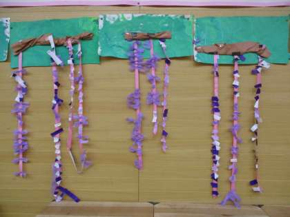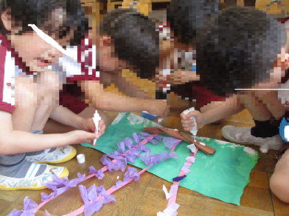 たくさんの花をつくり、大きな筆で葉っぱを描いて、木をつくって友達と協力して完成しました!