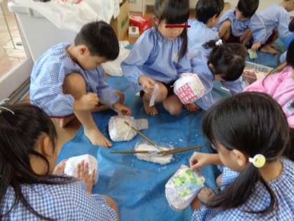 紙を貼り重ねて、乾かして、また重ねて…と根気よく頑張りました。