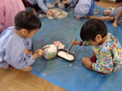 「きれいに貼れた!」「ここ、まだちょっと浮いてるなあ」と自分のつくったものを見ながら大満足の子どもたちでした。