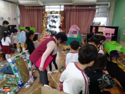 絵本の後は、女性会の方に作品展の案内をしました。「こっち見に来て」「これ、僕がつくってんで」と得意そうに知らせていた子どもたちです。たくさんほめていただいて、にこにこ嬉しそうでしたよ。