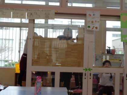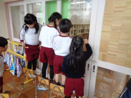 今は、保育室のドアにきれいに敷き詰めてタイルのように並べる遊びが流行っています。