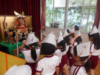 こいのぼり製作をしました。つくったこいのぼりを園庭でとばした時には、こいのぼりが風で泳いでる姿を見て、嬉しそうな表情をしていました。遊戯室に飾られた五月人形を見て、「刀があるよ!」「大きなかぶともある!」と気づいたことをたくさんの話してくれました。「こどもの日」への関心が高まっています。