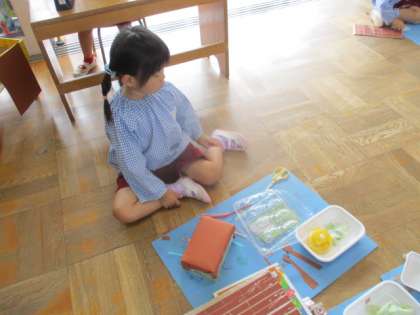 3匹いたカブトムシが1匹になってしまい、「寂しいよね」と話していると、「絵を描こう!」と言ってくれる子がいました。側にいた子たちも「描きたい」と言ってくれましたので、早速、カブトムシになって遊んだり、絵を描いたり、箱などの素材でつくってみたりと「ばら組カブトムシ」が増えました。楽しそうな姿がたくさん見られました。
