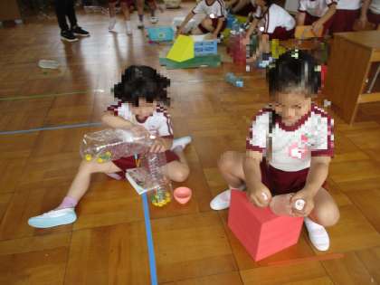 保育室でも色水のペットボトルを使っていろいろな遊びを楽しんでいます。