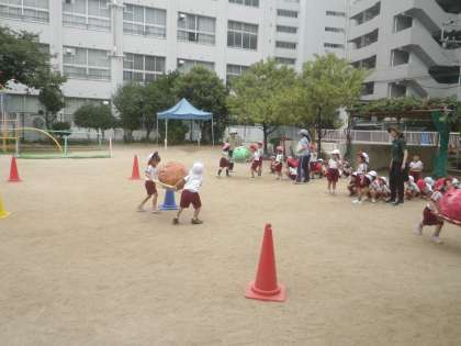 ルールを聞いて、友達とチャレンジ!「いっちに、いっちに」と息を合わせながらコーンを回って楽しみました。