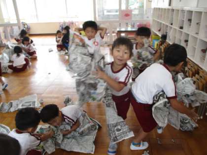 大きな野菜をつくるために、新聞紙をカラーポリ袋につめて野菜の形をつくりました。新聞紙を丸めてボールにしたり、びりっと破ってみたり、かけてお布団にしたり、色々な遊び方で楽しんだ後、ポリ袋をゴールにしてたくさん詰めてつくりました。このポリ袋に、ぬたくりを楽しんだ紙を巻いて素敵な野菜ができました!