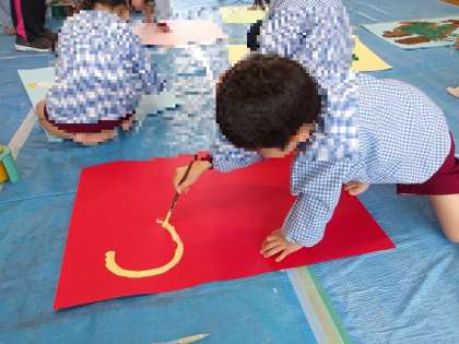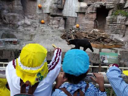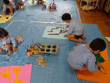 動物園に園外保育に行った翌日に動物の絵をかきました。「ワニをかきたい」「レッサーパンダにする」「カバさんの背中に魚がいっぱいいたところかきたい!」と自分のかきたい動物のイメージを膨らませ、かきあげていました。友達と話をしながらかくことを楽しんでいる年長児でした。