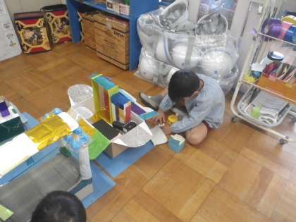 困ったことがあれば「ここをもっとキラキラにしたいけど、どうしよう?」「何色にしたい?一緒に探しに行こうね」「わかった!水色がいいな」と、先生と相談しながらすすめます。