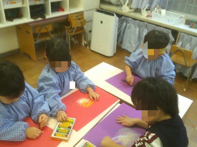 クレパスで好きな絵を描きました。クレパスで色をしっかり塗り込んだり、何色を使おうかなと考えたりしながら絵を描くことを楽しみました。お楽しみ会の次の日だったので、サンタさんに会えた喜びや嬉しさが大きく、興奮が冷めやらぬぱんだ組さん。絵を描いた後のお話では、「ここはサンタさんのおうち。今はまだ寝てるよ」「トナカイがここ!」「サンタさんにあげる秘密のお手紙なの!」などと伝えてくれました。