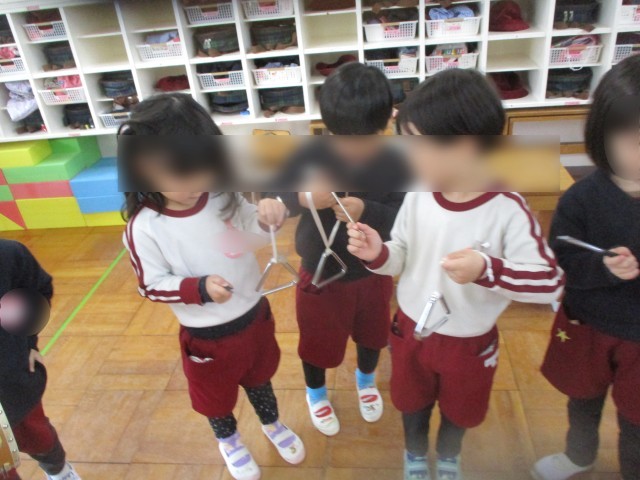 楽器遊びをしました。初日は音当てクイズをすると「サンタさんが来る音やから鈴や!」「これはカスタネット」など、耳を澄ませ楽器の音を聞いていました。実際に鳴らしてみると、思っていたよりも大きな音にビックリし、友達と顔を見合わせながら「楽しいね」と話ていましたよ。