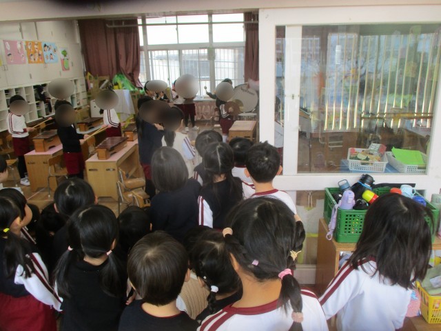 別日には、年長児の部屋から大きな音が…。「見に行ってみたい!」と子どもたち。見に行くと大きな楽器を鳴らしている姿があり「すごいな」「かっこいい」と憧れの目を向けていましたよ。