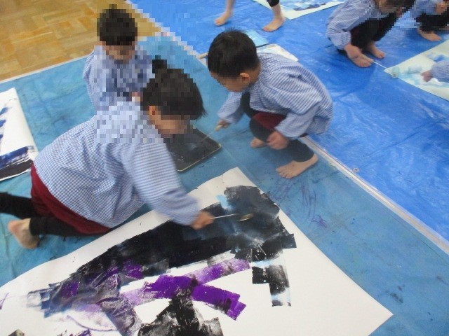 ローラーの使い方を知ると、子どもたちは目を輝かせ、バットの絵の具をローラーにつけながら、夢中になって描き始めました。最初は手の届く範囲で転がしていましたが、次第にダイナミックになり、模造紙を二枚繋げると、端から端まで勢いよくローラーを転がす姿が見られました。