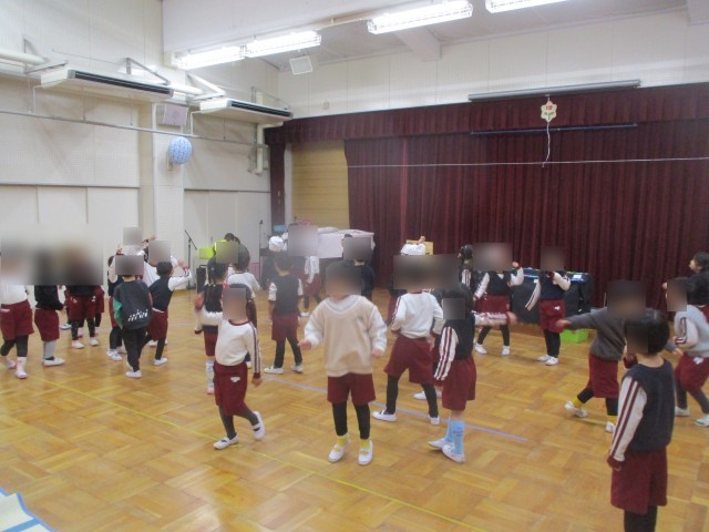 ばら組と劇遊びの見せ合いっこをしました。ばら組の『おばけのえんそく』では、友達がおばけになって遊んでいるところを笑顔で見たり、出てくる手遊びを客席で一緒にやってみたりしました。さくら組の『ゴリラのパンやさん』では、動物たちがみんなパンを買えたところで、ばら組にも「一緒に食べる?」と誘い、パンを買いに来てもらいました。お互いのダンスもみんなで踊って楽しんでいます。友達の劇を見る面白さや、友達に見てもらう嬉しさ、クラスだけで遊ぶのとは違う、みんなで遊ぶ楽しさを感じていた子どもたちでした。