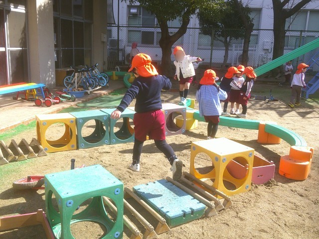 園庭でたくさん体を動かして遊ぶぱんだ組の子どもたち。カラーボックスや巧技台を組み合わせて迷路をつくっていました。どんどん遊具を運び、大きくなっていく迷路。周りの友達も「何これ!やってみたい!」と落ちないように迷路に挑戦していました。「こっちがスタートだよ!」「まだまだ大きくするね」と、友達と一緒に遊ぶことを楽しんでいました。