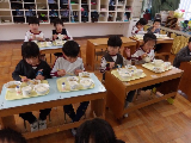残り少なくなってきた幼稚園での給食をみんなで楽しんでいます。