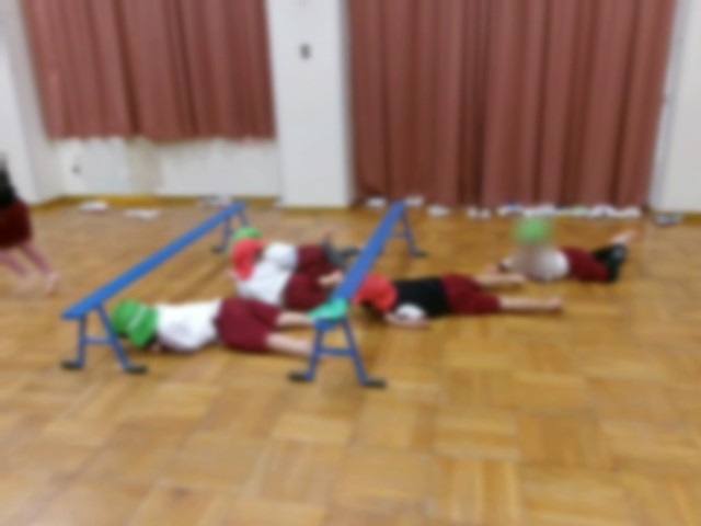 3月にこあら組と交流遊びをしました。こあら組のお友達が、いつも部屋で遊んでいた『平均台』や『マット遊び』、『トランポリン』、『フープ遊び』を遊戯室で一緒に遊ぶことにしました。ばら組とこあら組のペアになって、一緒に回ることにしました。先に平均台をくぐり終わった子は、ペアの子を優しいまなざしで見守りながら待っている姿にほっこりした気持ちになりました。