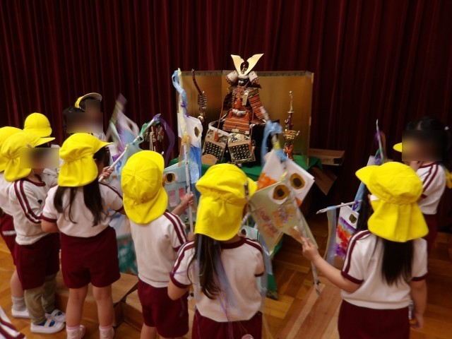 つくったこいのぼりで遊びました。遊戯室でつくったこいのぼりを泳がせたり、五月人形に見せたりして楽しそうに遊んでいました。
