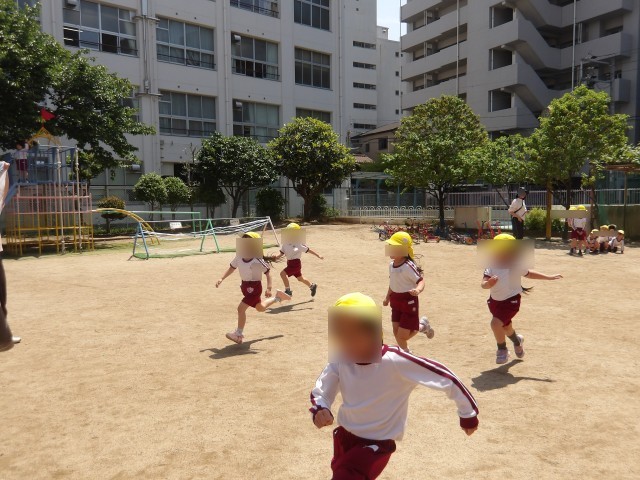 園庭でもこいのぼりに向かって走り、元気いっぱい遊びながらこいのぼりに親しみました。