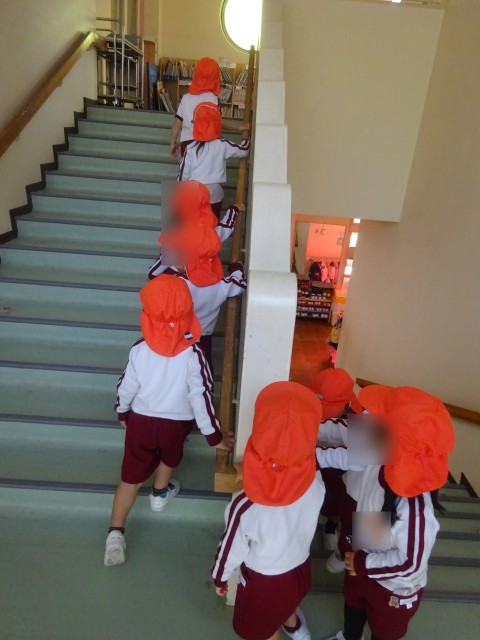 お友達の後ろに並んで歩くことも、階段の昇り降りもとっても上手でしたよ。年長組をのぞくと、お兄さんお姉さんが手を振ってくれたので、とてもうれしかったようです。大きな遊戯室で遊ぶことも楽しみにしています。