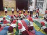 運動会に向けて、パラバルーンでどのような技をしたいか子どもたちと考えながら取り組...