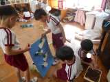 実やどんぐりを転がす「転がしゲーム」をつくっています。初めは転がることを楽しんで...
