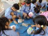 みんなで、はりこの入れ物づくりをしています。 紙を貼り重ねて、乾かして、また重ね...