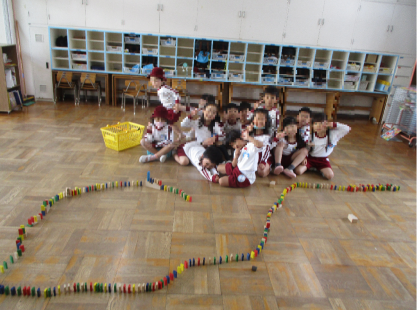 進級し、新しい遊具で楽しく遊んでいます。 今日は、そら組みんなでドミノ遊びに挑...